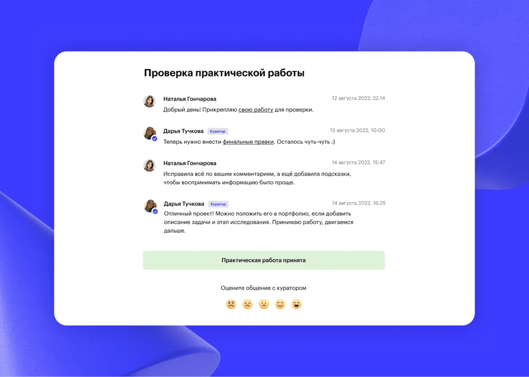 У вас будут проверяющие эксперты и куратор в Telegram-чате курса. Они прокомментируют практические работы, дадут полезные советы и ответят на любые вопросы. Вы сможете перенять их опыт, профессиональные знания и лайфхаки.