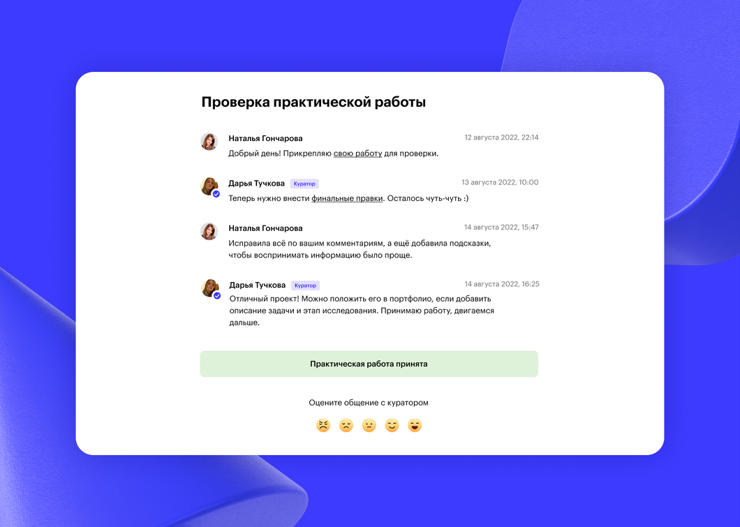 У тебя будет куратор в Telegram-чате, а проверяющий эксперт прокомментирует практические работы и даст полезные советы. Так ты сможешь перенять опыт, профессиональные знания и лайфхаки.