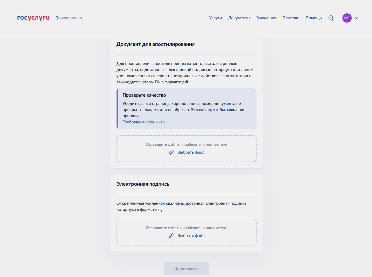 Электронный апостиль можно поставить на документы об образовании и на нотариально заверенные электронные копии. К электронной копии документа потребуется откреплённая подпись нотариуса в формате SIG или P7S — её нужно прикладывать к заявлению.