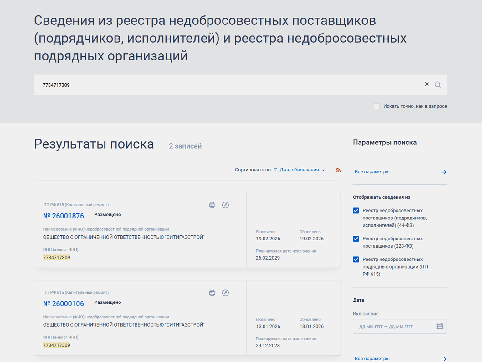 Последний пункт — реестр по постановлению №615 от 01.07.2016 года — включает недобросовестных подрядчиков по капитальному ремонту в многоквартирных домах. Это частный случай закупок с учётом норм 44-ФЗ — в этом материале мы не будем подробно на нём останавливаться.