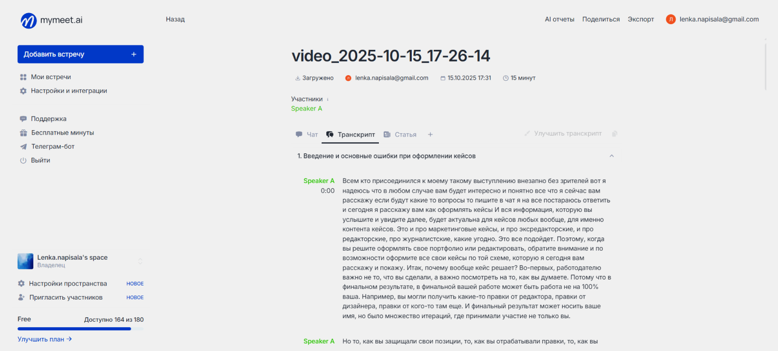 Кроме интервью с клиентами, я использую MyMeet и на внутренних встречах команды. Он помогает фиксировать договорённости, задачи и идеи. Иногда после совещаний мы используем отчёт MyMeet как черновик для постмита — краткого конспекта встречи.