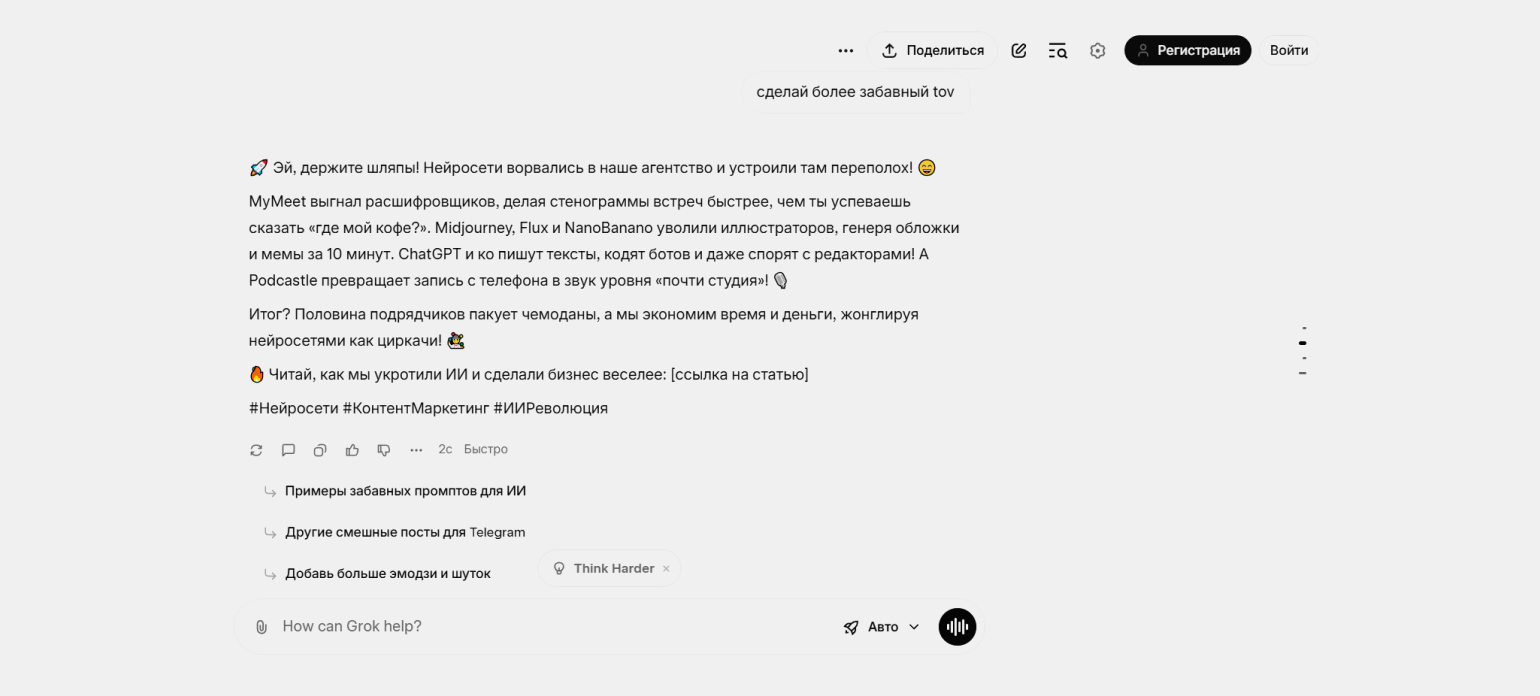 - Grok — ориентирована на короткий контент, тренды и контент для соцсетей.