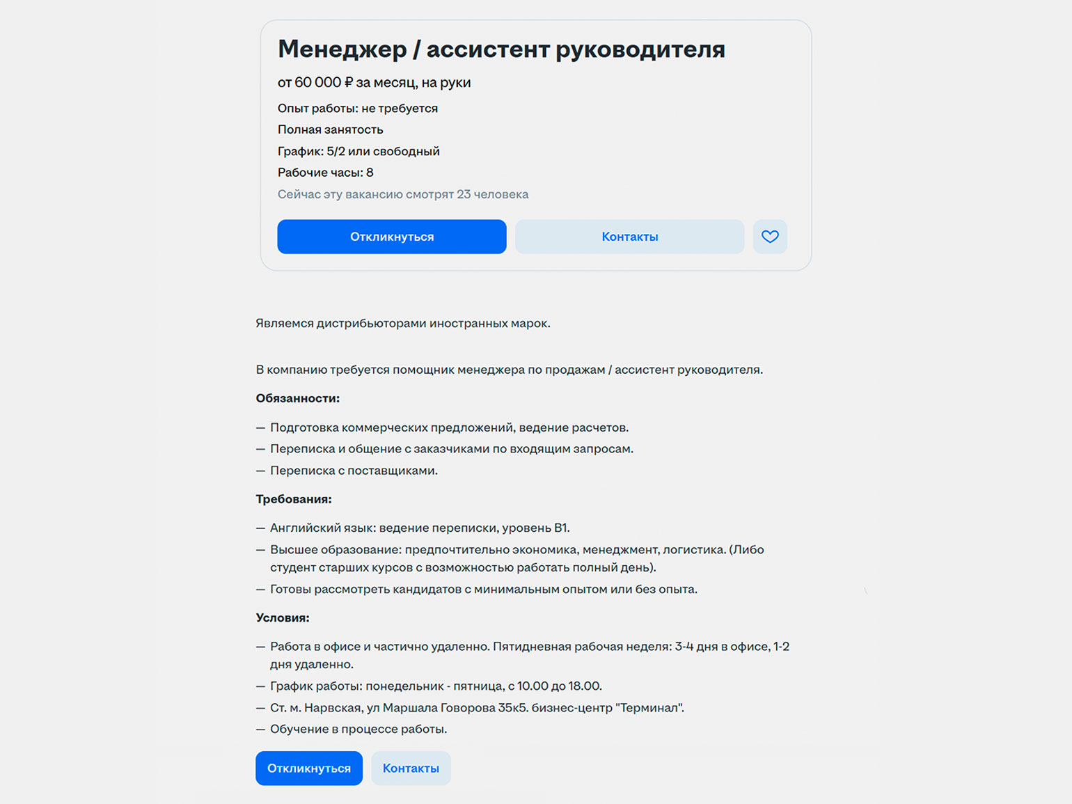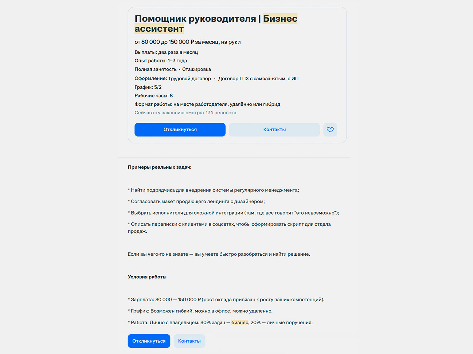 При этом зарплаты для новичков могут быть низкими, особенно на позициях с частичной занятостью. В вакансиях без требований к опыту нередко предлагают 10–20 тысяч рублей в месяц за несколько часов работы в день или выполнение отдельных поручений. При полной занятости начинающие ассистенты могут рассчитывать на 40–60 тысяч рублей в месяц.