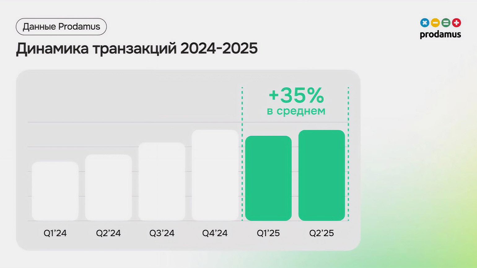 В компании Prodamus отмечают похожую динамику: оборот клиентов сервиса в первом квартале 2025 года вырос на 10% год к году, а во втором — на 13%. Количество компаний с ежемесячным оборотом от 1 миллиона рублей за тот же период увеличилось на 14 и 9% соответственно. По прогнозам, во втором полугодии рост может составить ещё 12–15%.