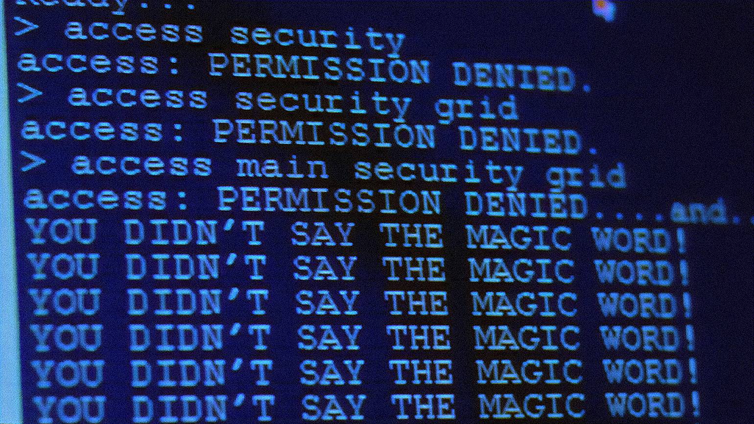 В фильме «Парк Юрского периода» 1993 года главный инженер парка пытается подключиться к системе безопасности, но терпит неудачу из-за того, что его компьютер взломан. Зритель при этом видит синий экран с надписью «YOU DIDN’T SAY THE MAGIC WORD!» («Ты не сказал волшебное слово!»).