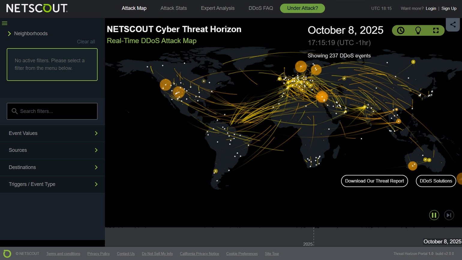 На сайте horizon.netscout.com вы найдёте интерактивную карту кибератак, которые в реальном времени происходят по всему миру. С помощью фильтров вы можете выделять регионы, выбирать виды атак или отслеживать всплески активности. Перед вами предстанет одновременно тревожная и завораживающая картина — глобальный трафик киберугроз, который без остановки движется днём и ночью.