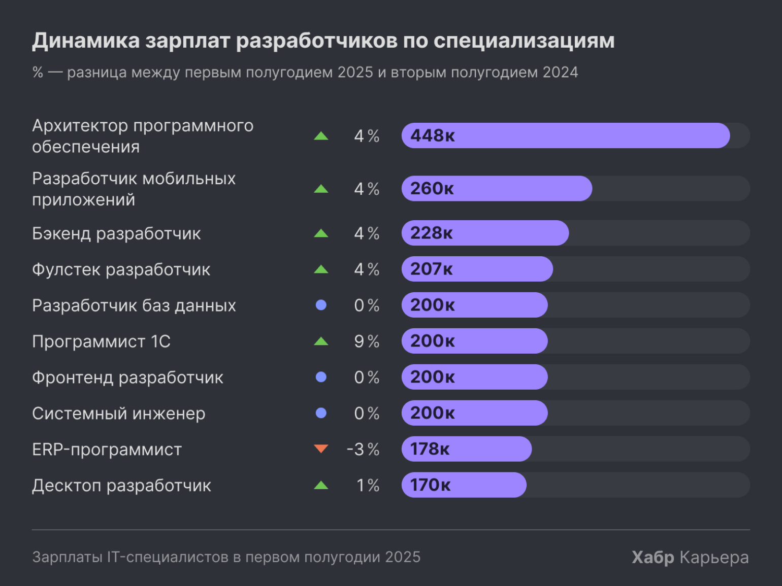 По данным «Хабр Карьеры» за первое полугодие 2025 года, медианная зарплата архитектора в ПО в России — 448 000 рублей. Это заметно выше, чем у большинства мобильных и бэкенд-разработчиков — разница может достигать 50–60%.