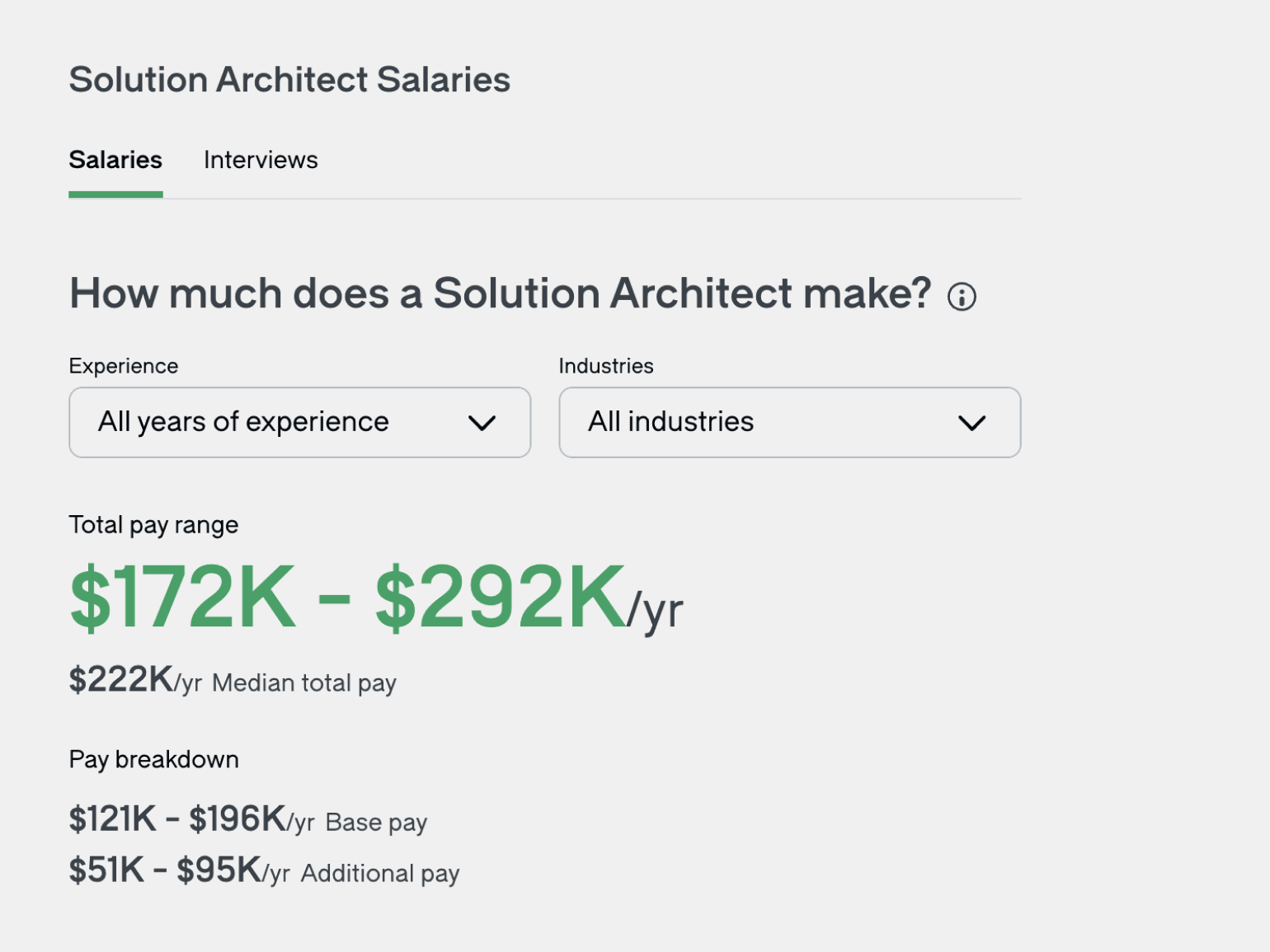 За рубежом доходы значительно выше. В США медианная зарплата архитектора ПО составляет около 222 тысяч долларов в год. При этом диапазон тоже широкий — примерно от 106 тысяч долларов до 311 тысяч долларов в зависимости от компании, штата и специализации.