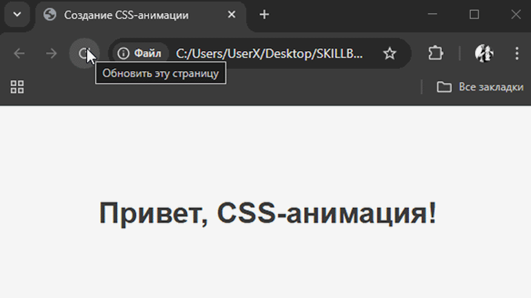 Если открыть эту страницу в браузере, вы увидите, как воспроизводится CSS-анимация появления элемента <h1> на HTML-странице: