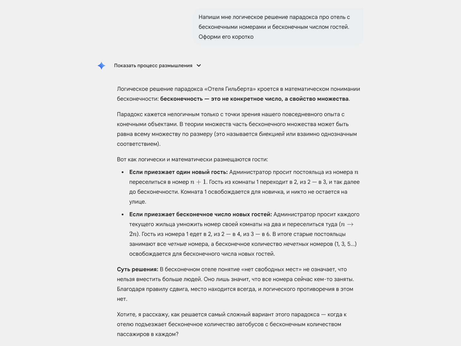Мы попросили модель решить парадокс «Гранд-отеля» Давида Гильберта. Вот какой ответ получили:
