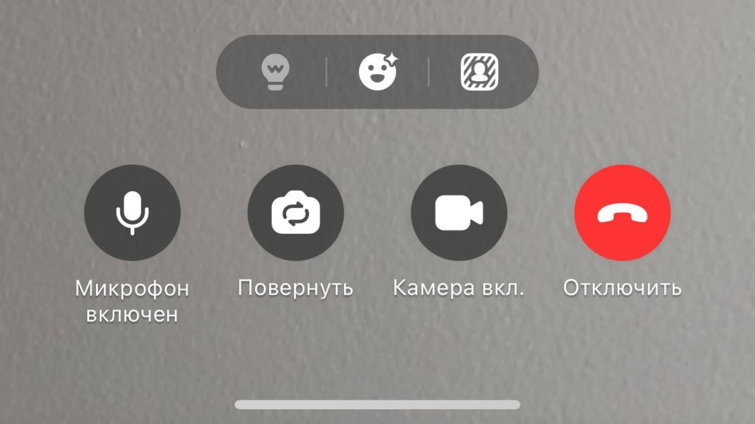 Во время видеозвонка вам доступны две панели инструментов. На нижней расположен стандартный набор: микрофон, переключение камеры, отключение камеры и завершение звонка. На верхней — три кнопки для работы с изображением. Лампочка открывает декоративные рамки с усиленной экспозицией — удобно для вечерних звонков. Кнопка с эмодзи даёт доступ к фильтрам цветокоррекции и инструменту ретуши Пластика. Третья кнопка размывает фон.