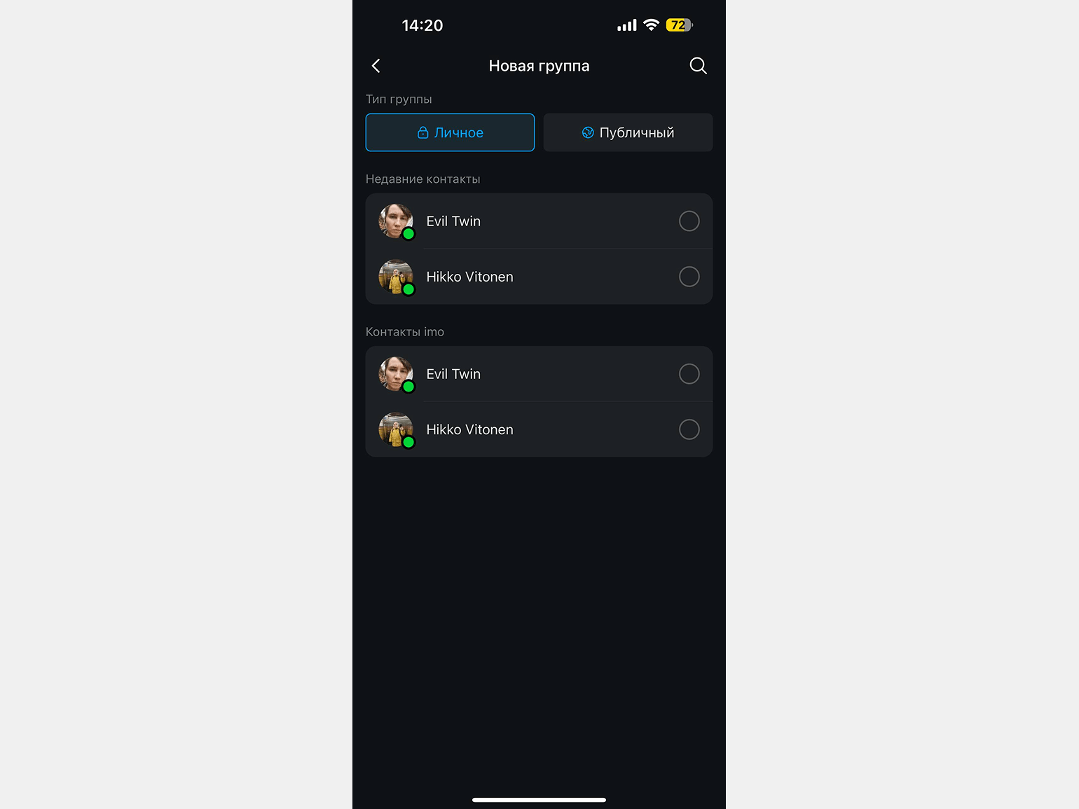 В Imo можно создавать три типа сообществ: приватные группы, публичные группы и комнаты. Чтобы создать группу, нажмите + в главном окне и выберите Новая группа. Затем укажите тип — Личное или Публичный — и выберите участников из списка контактов.
