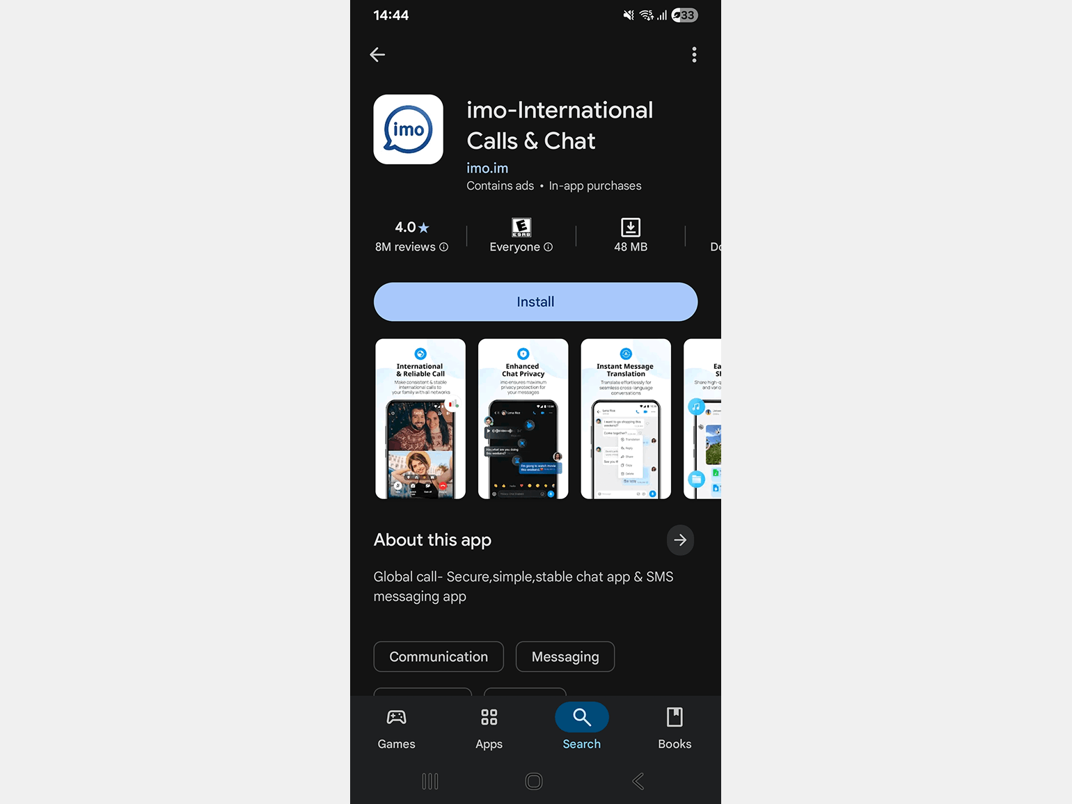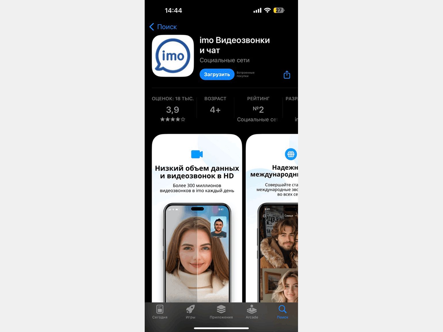 В App Store найдите приложение «Imo Видеозвонки и чат», а в Google Play Store — «Imo Видеозвонки». Скачайте мессенджер и запустите.