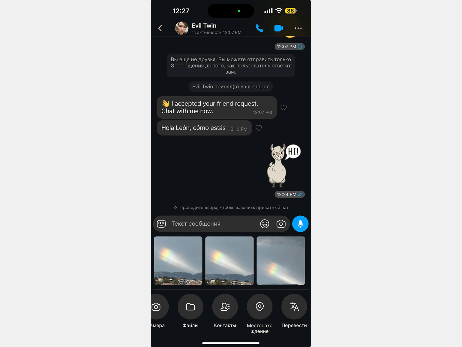Когда адресат подтвердит ваш запрос, можно будет начать общение. Чат работает так же, как в других мессенджерах: вы можете отправлять фото, видео, голосовые сообщения, эмодзи и стикеры из наборов Imo. Текстовые сообщения можно автоматически переводить на один из 26 языков. Для этого перед набором сообщения нажмите + слева от строки чата, пролистайте меню и выберите опцию Перевести.