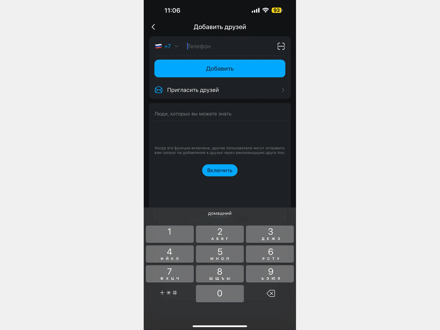 В новом окне введите номер телефона пользователя, которого вы хотите добавить. Если у него уже есть аккаунт Imo, то он сразу появится в вашем списке контактов. Если аккаунта нет, выберите опцию Пригласить друзей — это позволит отправить приглашение через SMS, поделиться пригласительной ссылкой через другой мессенджер (например, Telegram) или отправить его по почте.