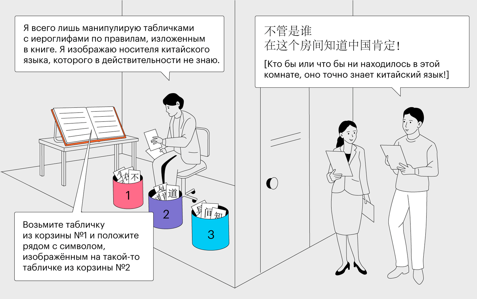 Рисунок, иллюстрирующий суть мысленного эксперимента «Китайская комната»