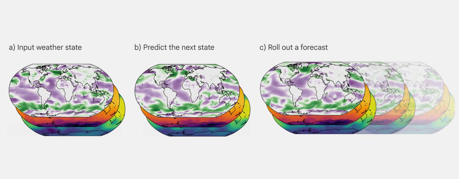 Один из таких примеров — модель GraphCast, разработанная командой DeepMind. Она обучена на архивных данных о погоде и способна быстро прогнозировать развитие атмосферных процессов на несколько дней вперёд.