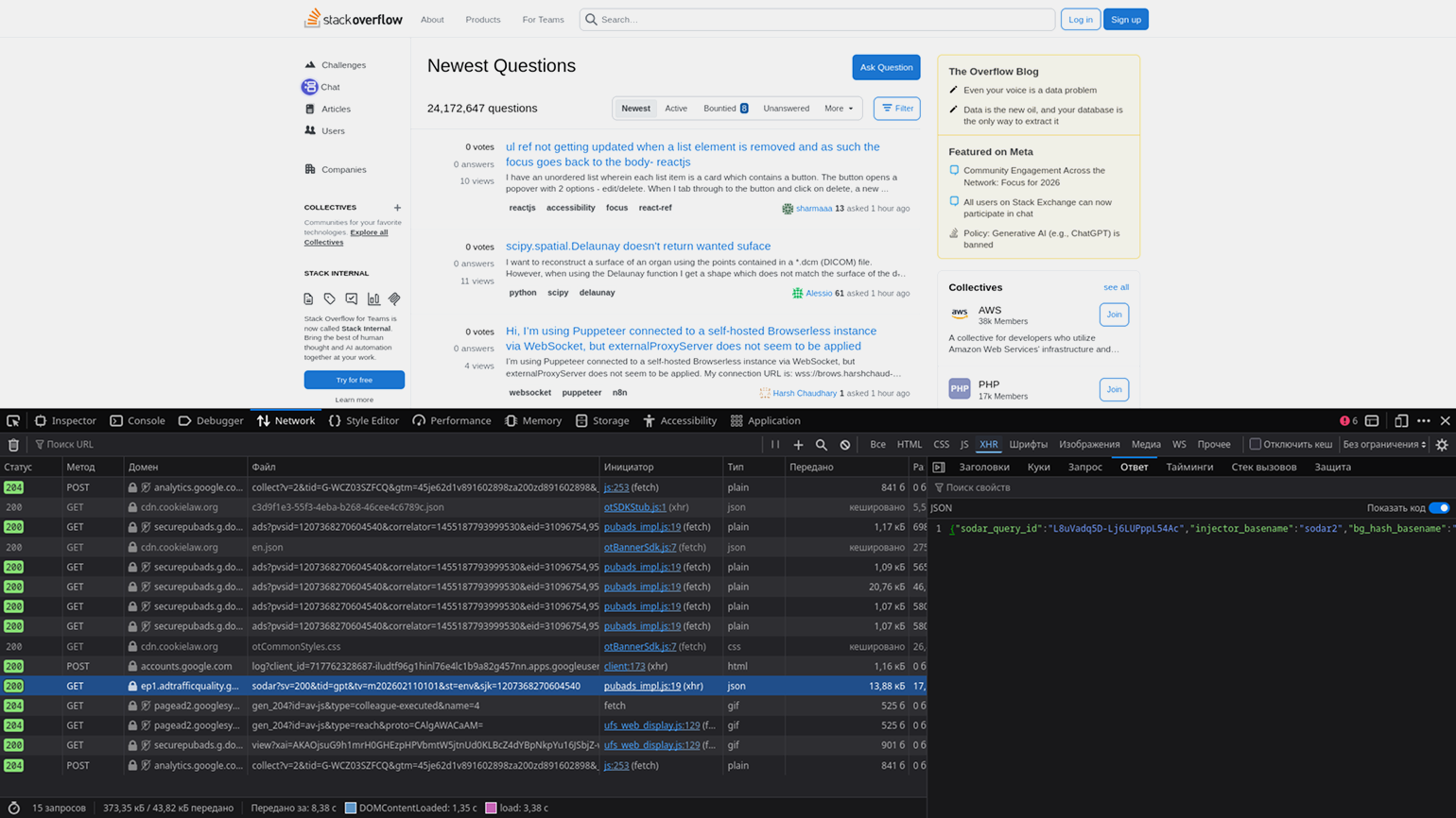 Такой же способ подгрузки дополнительного контента реализован на платформе Stack Overflow. Для примера откроем раздел Newest Questions. Если перейти на следующую страницу (например, на страницу 2), на сайте подгрузятся новые вопросы. А если открыть инструменты разработчика и перейти во вкладку Network, среди запросов вы увидите JSON-файлы с данными о вопросах:
