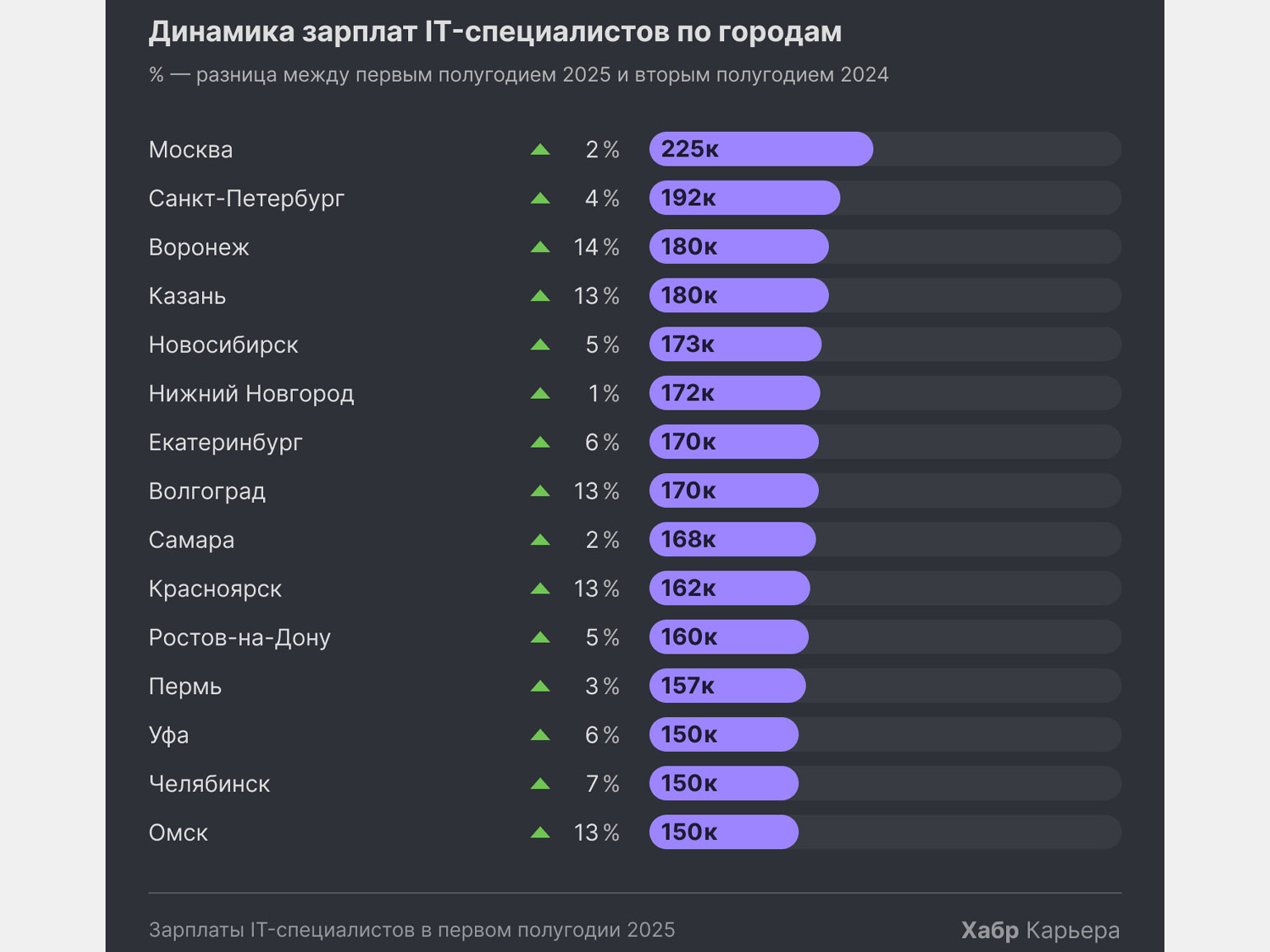 Востребованность айтишников отражает и уровень доходов. По данным «Хабр Карьеры» за первое полугодие 2025 года медианная зарплата IT-специалистов в России составляет 182 700 рублей. Её уровень зависит от нескольких факторов, основной из которых — специализация. Например, разработчики зарабатывают в среднем на 90% больше, чем дизайнеры.