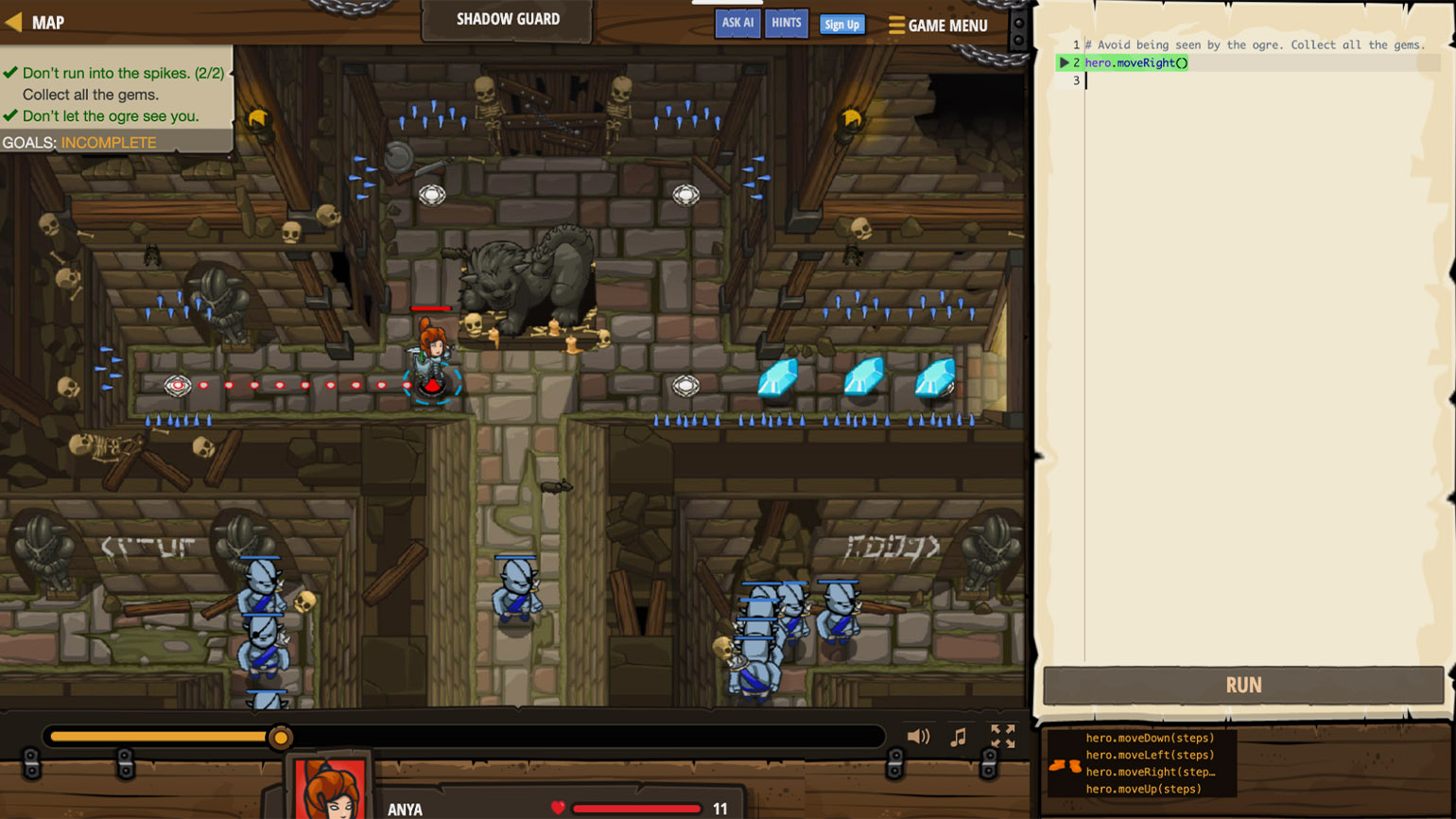 Если интерактива недостаточно, можно присмотреться к играм, специально созданным для изучения программирования. Одна из самых популярных — CodeCombat. В ней ученик управляет персонажем, путешествует по вымышленному миру, сражается с разными существами, собирает лут и прокачивает персонажа. Всё это он делает с помощью написания кода. Кроме CodeCombat можно попробовать CodeStrike, Screeps и Human Resource Machine.