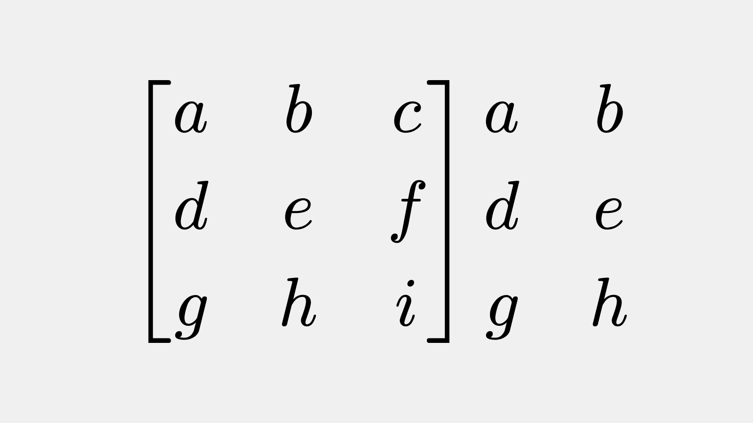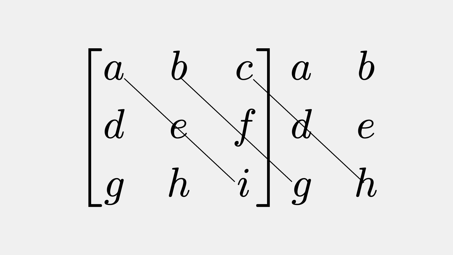 Чтобы найти детерминант, необходимо продублировать первые два столбца матрицы справа и посчитать произведения по диагоналям с учётом знаков.