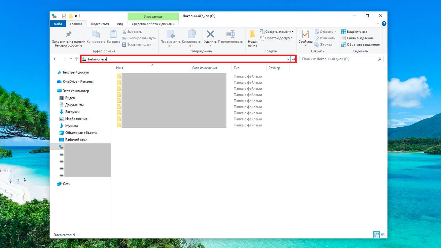 Есть и чуть менее очевидный вариант: открыть Проводник, щёлкнуть по адресной строке, ввести taskmgr или taskmgr.exe и нажать Enter. Windows запустит системную программу так же, как если бы вы сделали это через окно «Выполнить».