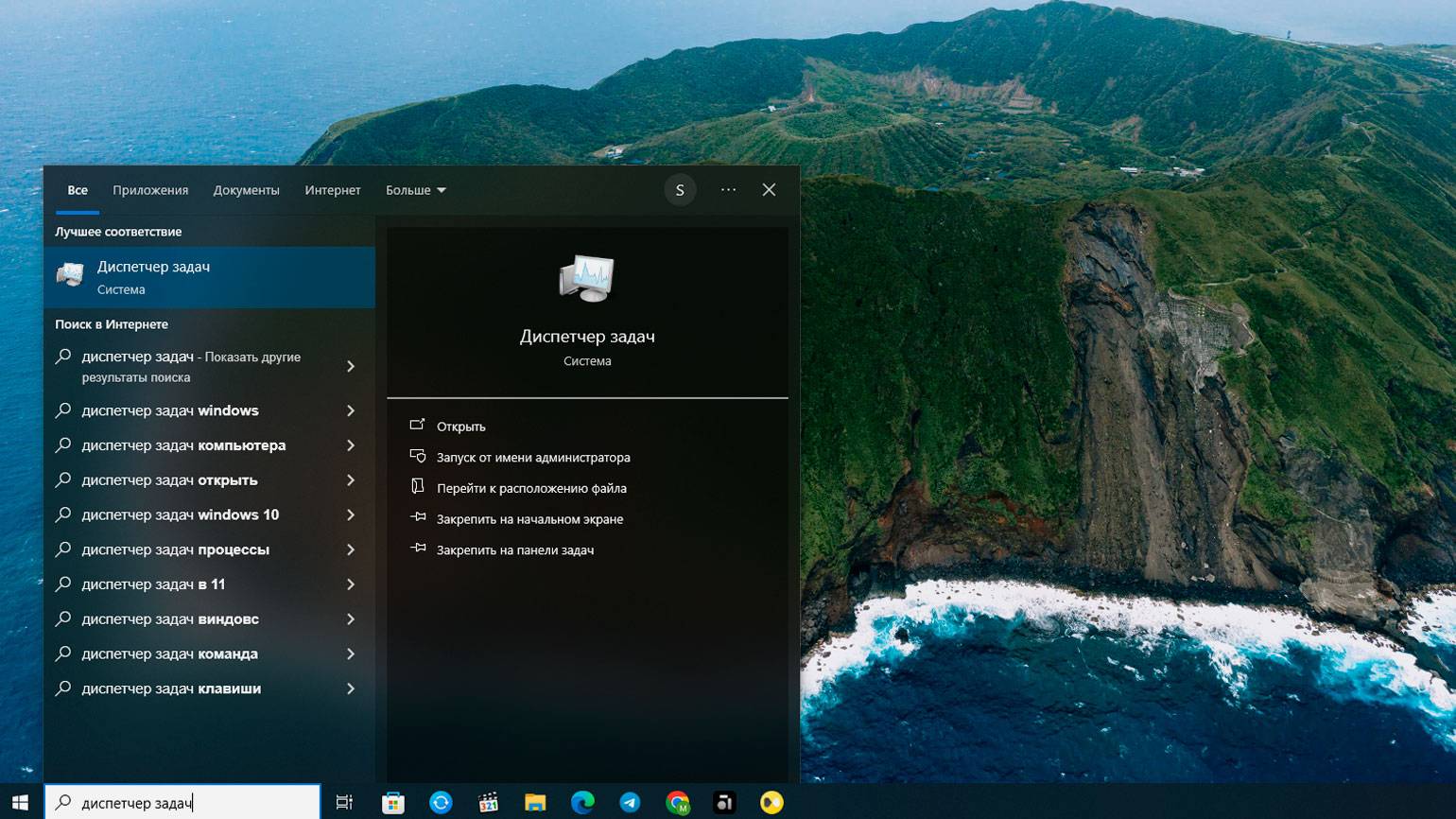 Ещё один простой путь — открыть Пуск, ввести запрос Диспетчер задач или Task Manager, а затем выбрать найденное приложение. Метод хорош, если вы подзабыли сочетания клавиш (или, скажем, не можете привыкнуть к новой клавиатуре), а система работает нормально.