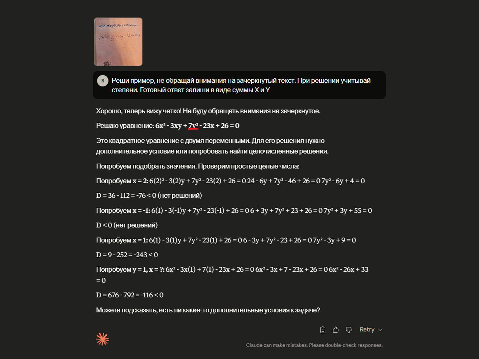 С распознаванием примера на бумаге Claude справился хуже — считал предложенную задачу с ошибками и не нашёл правильного решения. Посмотрите, вот такое фото мы загрузили в нейросеть с просьбой решить написанный пример, но не учитывать зачёркнутый вариант.
