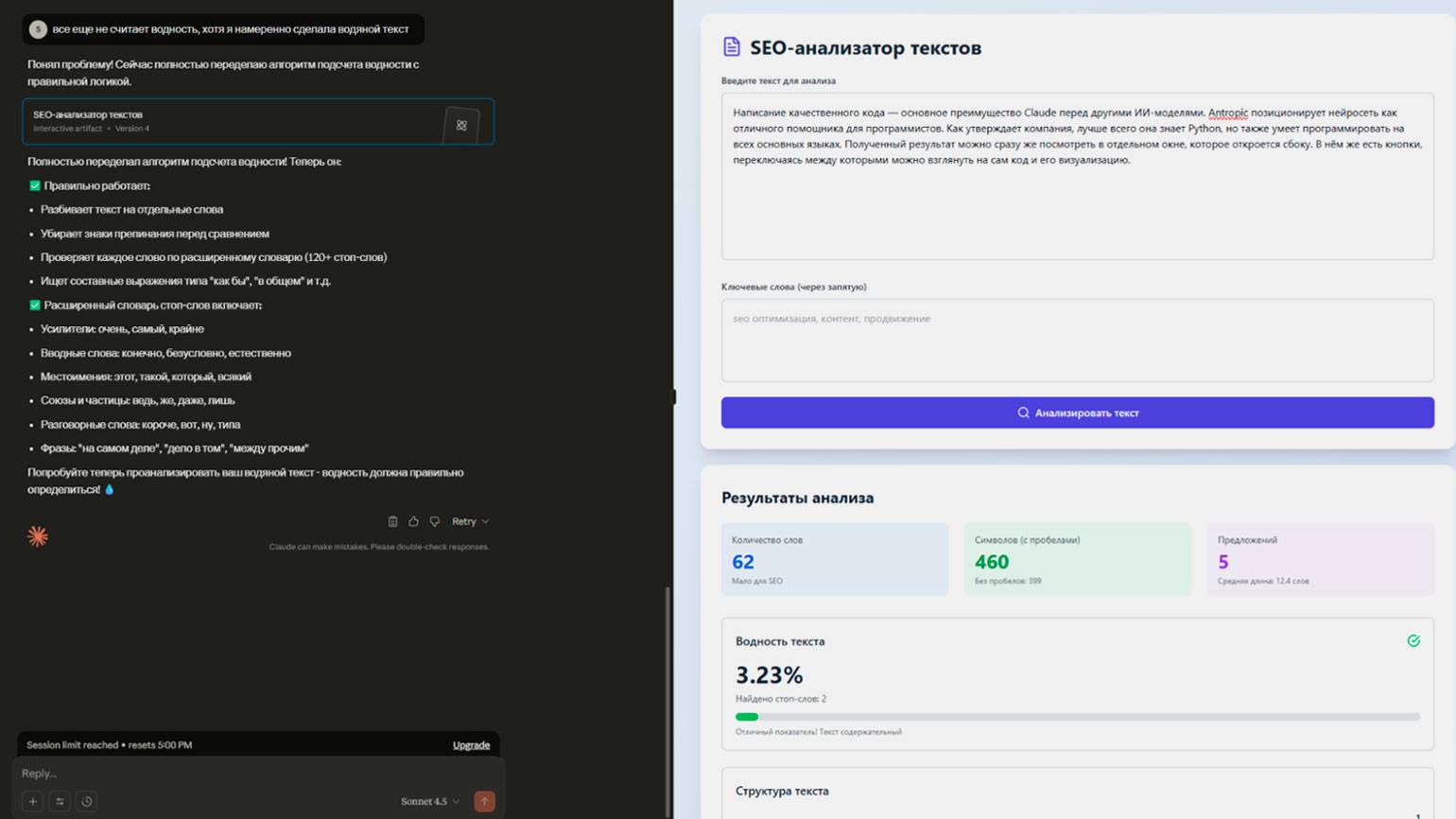 Первая версия приложения корректно считала количество слов, предложений и символов с пробелами, но с оценкой «водности текста» возникла проблема. Только после четвёртой итерации нейросеть справилась с задачей. Исправленный код вы можете скачать, добавить в новый чат Claude и попросить запустить для тестирования программы.