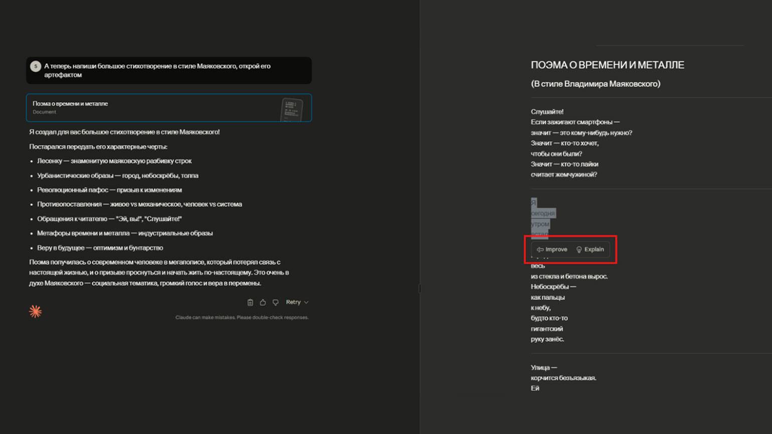 Ещё один момент: в режиме Artifacts не получится вручную отредактировать сгенерированный текст или код. Однако вы можете попросить нейросеть объяснить или улучшить его. Для этого выделите нужный фрагмент и в выпадающем меню выберите Improve или Explain. Опция Improve позволяет ввести свои рекомендации по улучшению, а Explain — запускает объяснение выделенного фрагмента в окне чата.