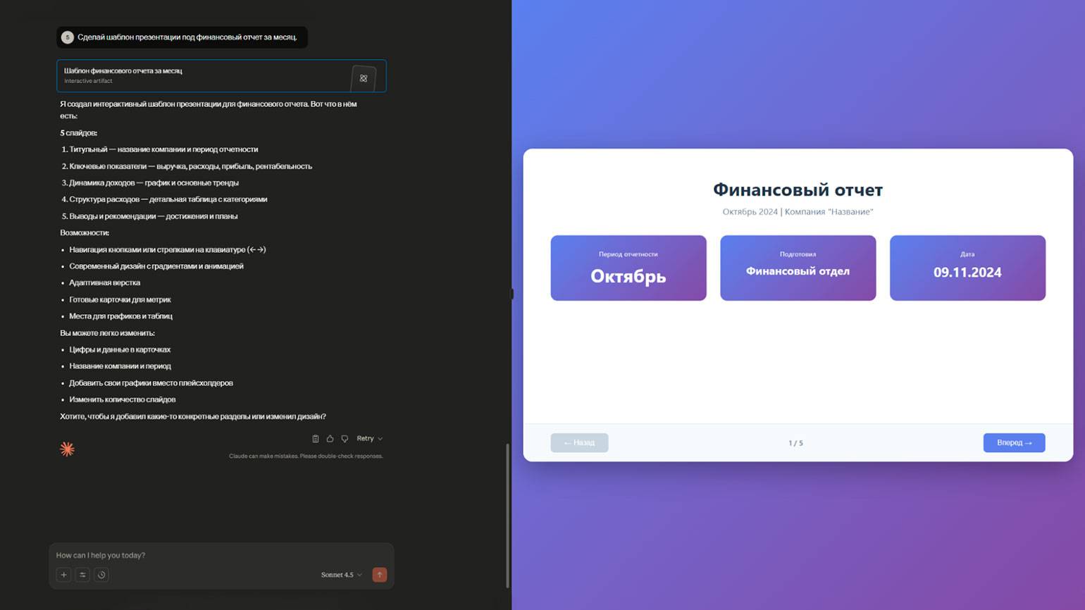 В целом Claude — отличный помощник для программистов. Нейросеть помогает писать код, вносить правки и сразу видеть результат. Например, при разработке веб-приложения на React модель не только генерирует нужный компонент, но и показывает его работу в интерактивном режиме. Вы сможете прокликать кнопки, ввести данные и проверить функциональность в интерфейсе чата — очень удобно.