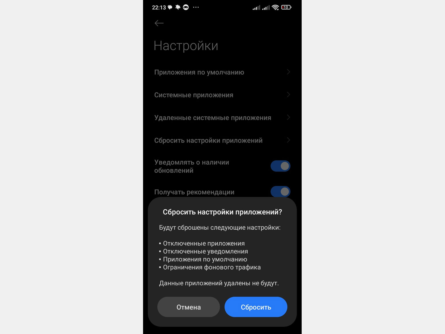 Для Android: Настройки → Приложения → Все приложения → нажмите на три точки в правом верхнем углу → выберите Сброс настроек приложений.