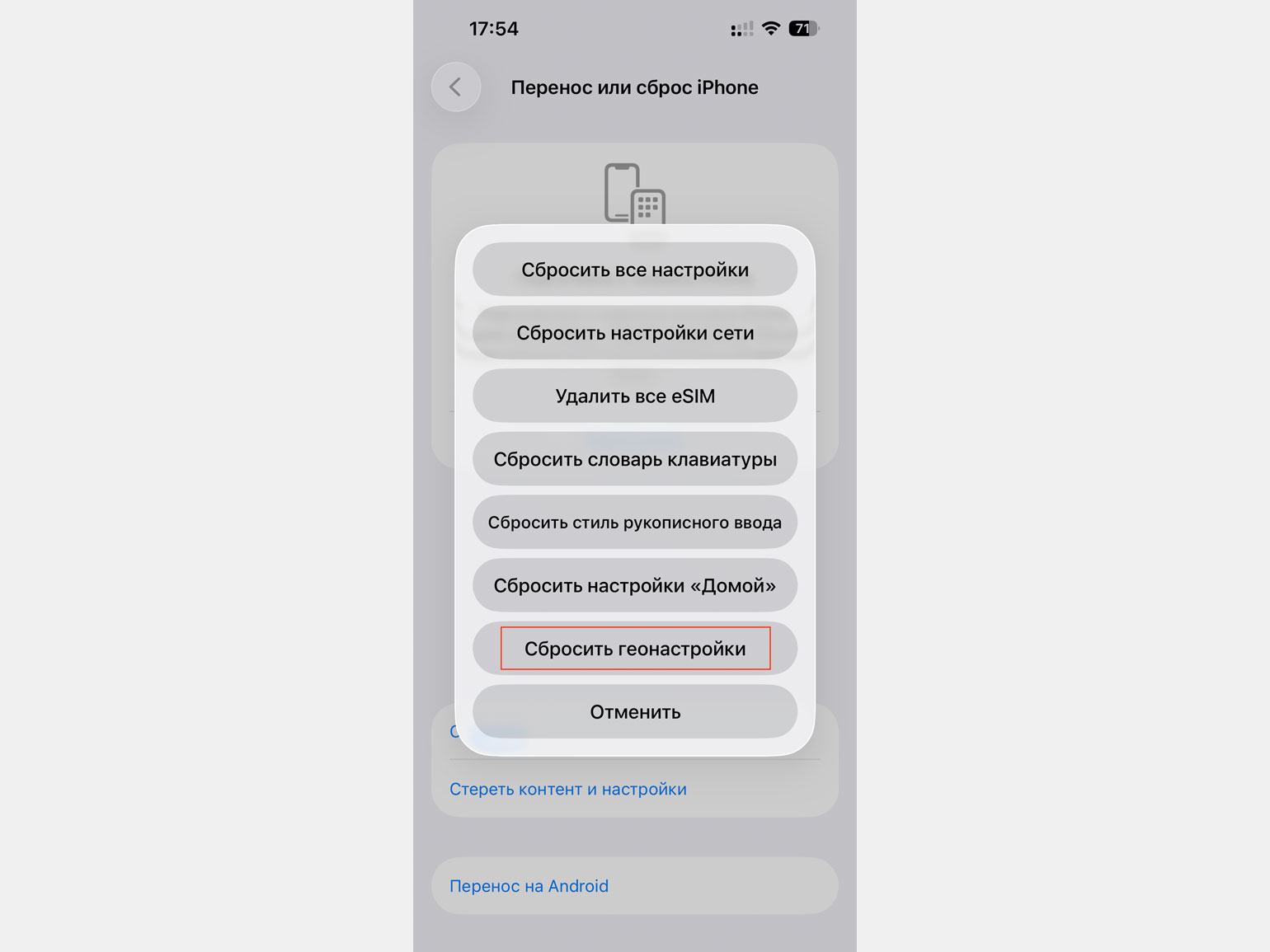 Для iOS: Настройки → Основные → Перенос или сброс iPhone → Сбросить → Сбросить геонастройки. После этого настройки доступа для всех приложений будут сброшены.