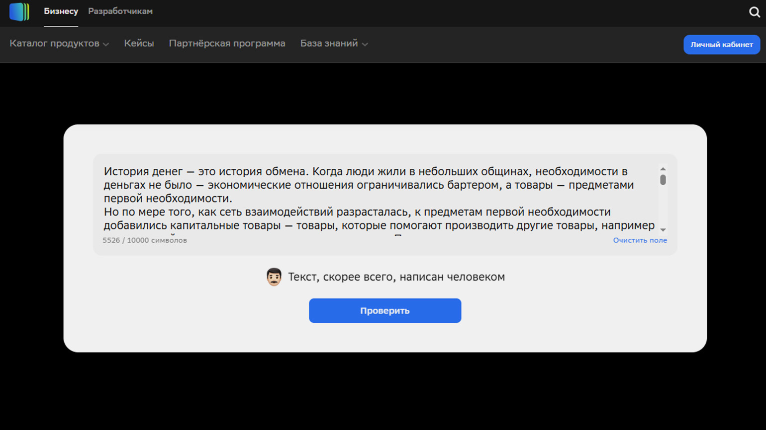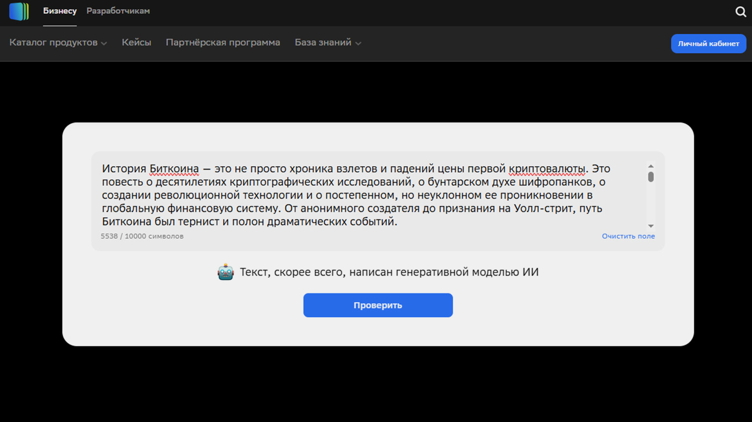 Сервис «Сбера» проверяет только русскоязычные тексты и достойно с этим справляется. На момент запуска сервиса летом 2024-го разработчики обещали точность до 94,7%.