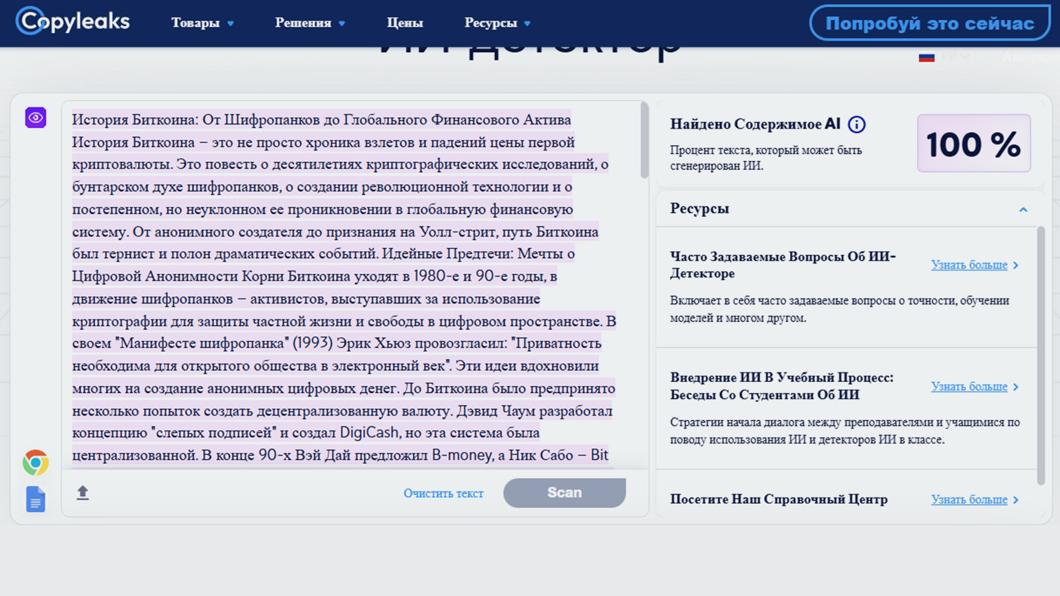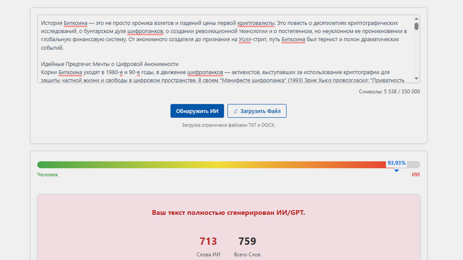 Мы будем тестировать сервисы на двух текстах об истории биткоина: авторском и сгенерированном Gemini. Поочерёдно загрузим каждый из текстов в сервис и посмотрим, как он их оценит. Проверка будет считаться пройденной, если сервис сообщит, что авторский текст написан человеком, а сгенерированный — нейросетью.