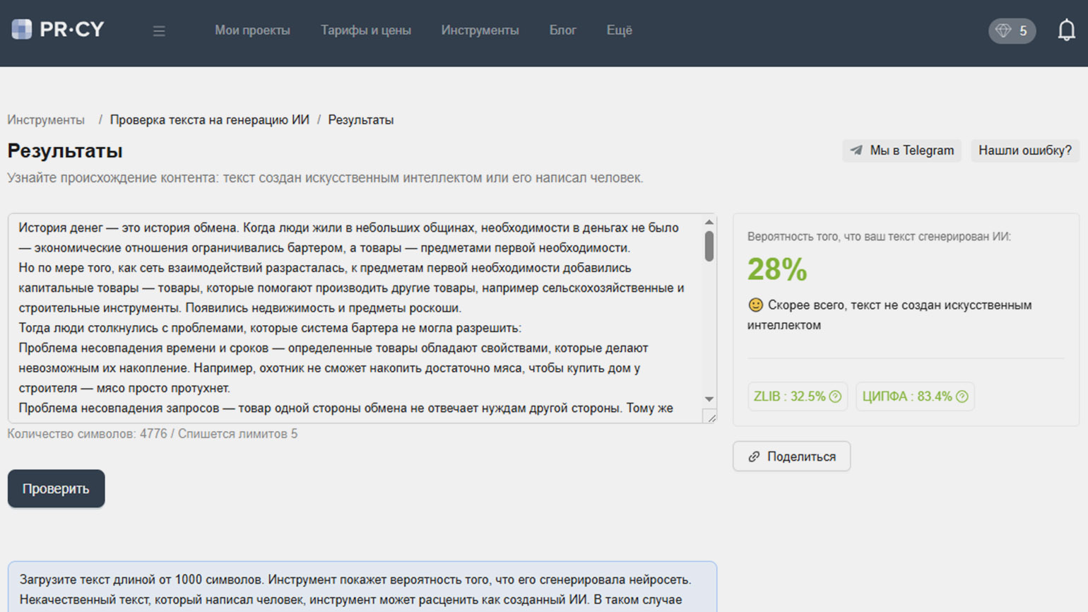 PR-CY — ещё один российский сервис, который рекомендуют в Сети. Сервис платный — протестировать большой объём бесплатно не выйдет. Чтобы протестировать оба текста, мы их немного сократили.