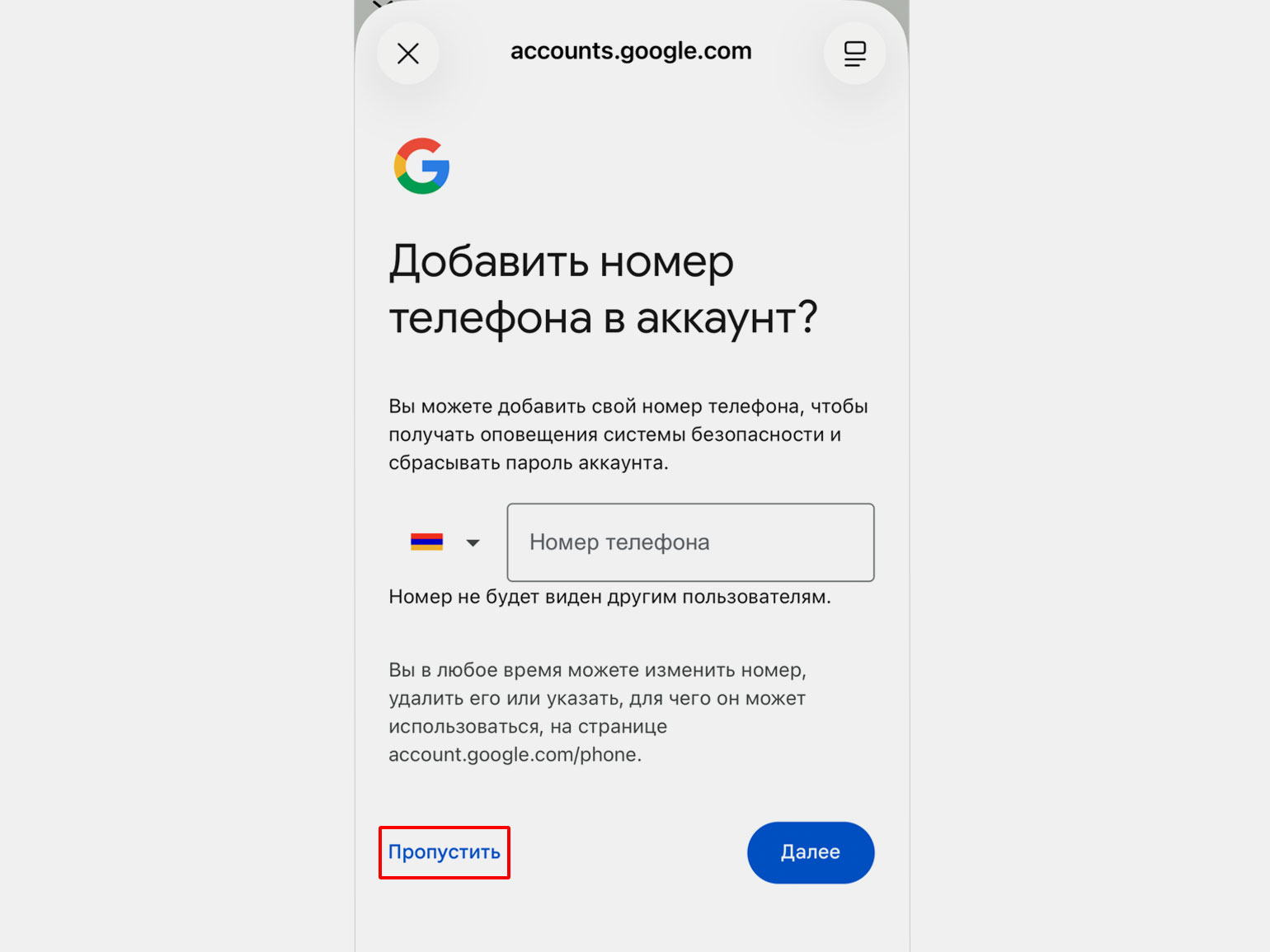 Шаг 6: добавьте и подтвердите номер телефона. Номер российского оператора связи не подойдёт. При регистрации в Google Play или YouTube нажмите кнопку Пропустить.