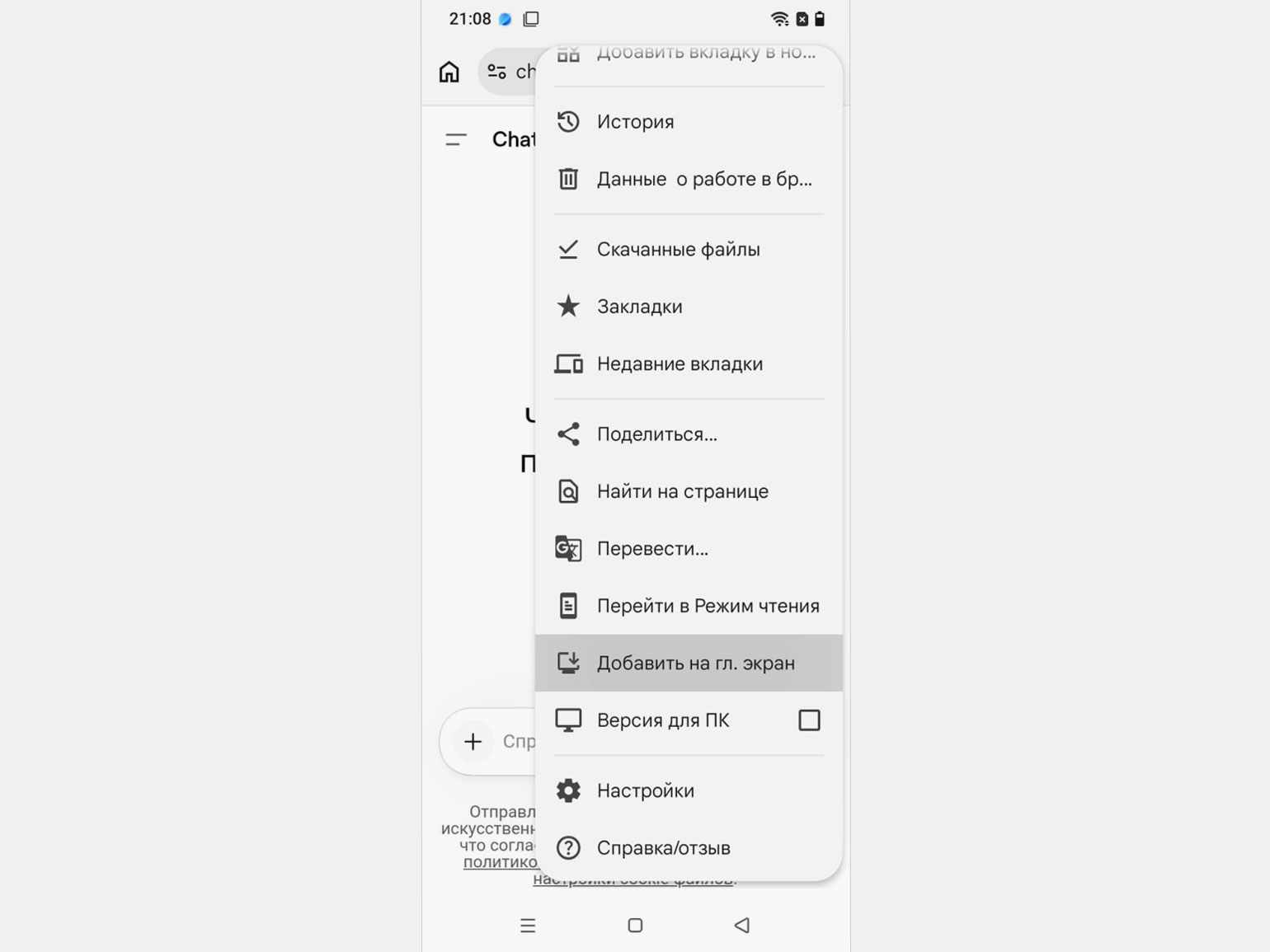 Шаг 3: нажмите на три точки в верхнем правом углу экрана, чтобы открыть меню браузера. Выберите в нём пункт Добавить на гл.экран.