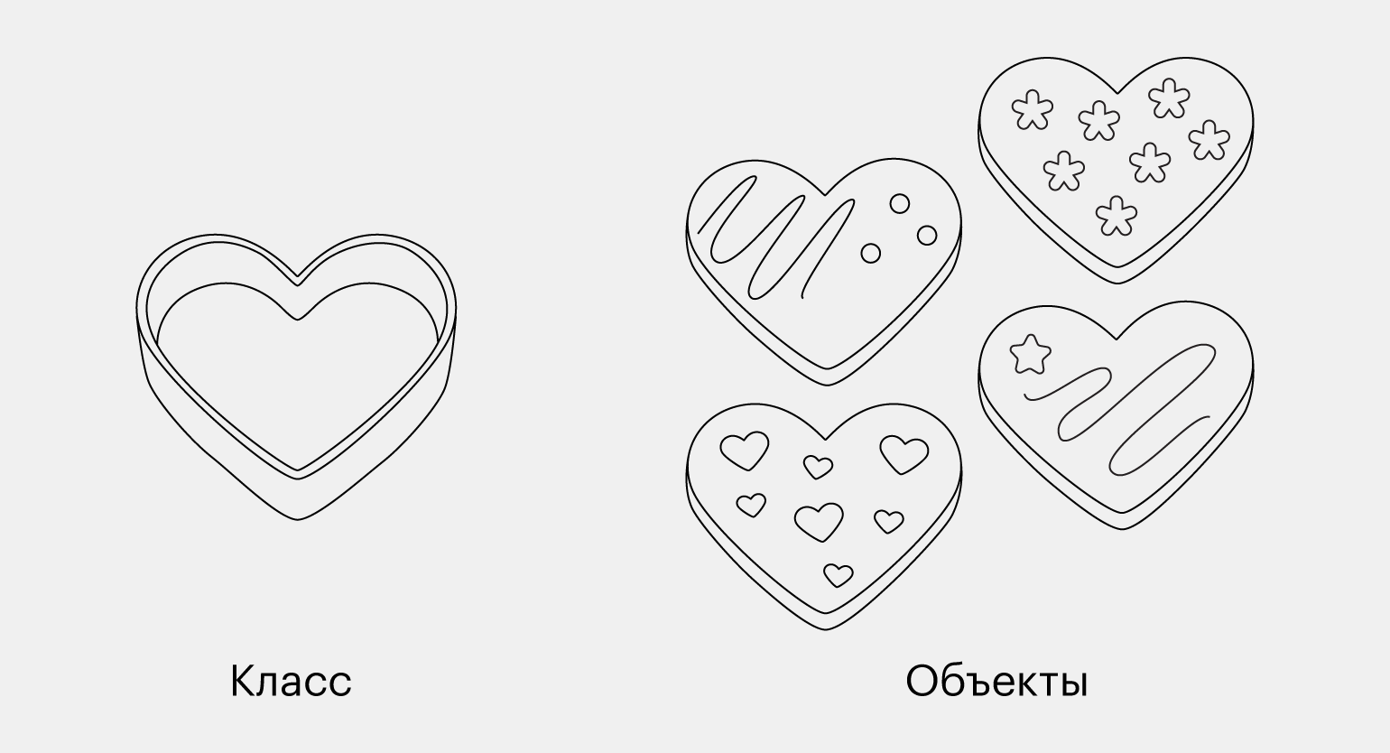 Чтобы лучше понять эту концепцию, рассмотрим пример из реальной жизни. Кондитер использует одну формочку, чтобы испечь партию печенья. Все печенья имеют одинаковую форму, но могут отличаться начинкой и вкусом. В этом примере формочка — это класс, а отдельные печенья — объекты этого класса.