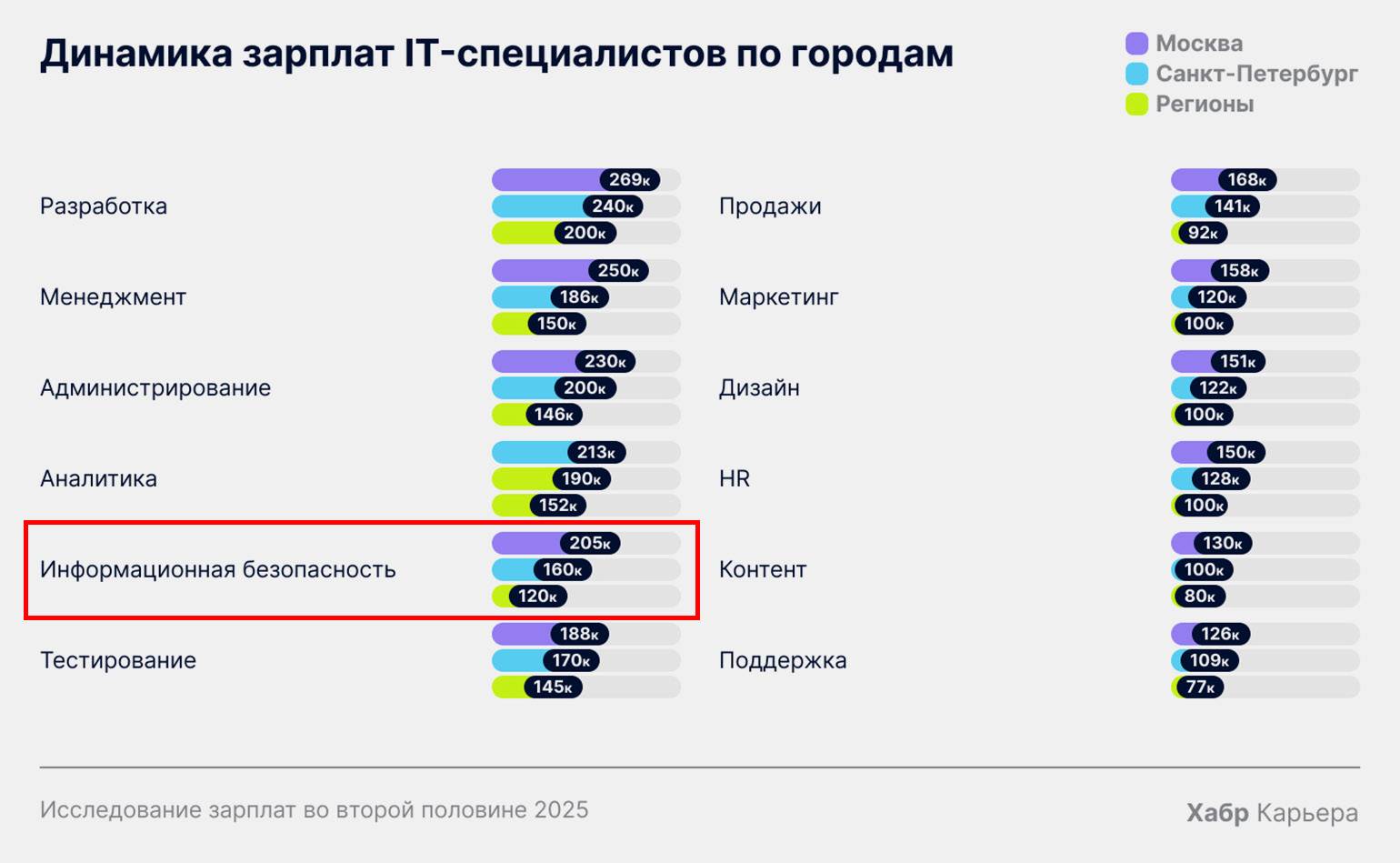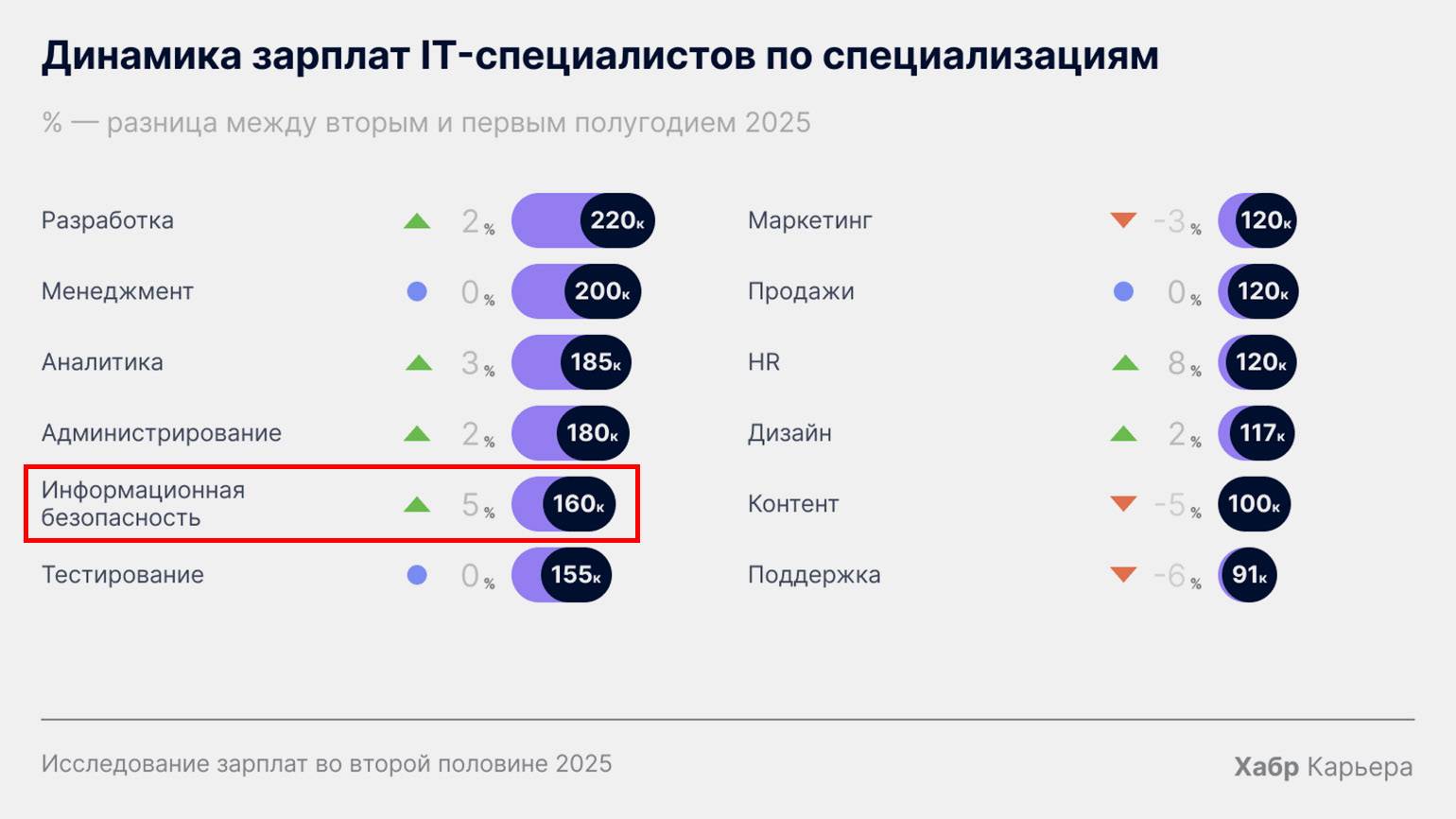 Для начала обратимся к исследованию «Хабр Карьеры» за вторую половину 2025 года. В нём сказано, что зарплаты специалистов по информационной безопасности выросли на 5% по сравнению с первым полугодием 2025-го.