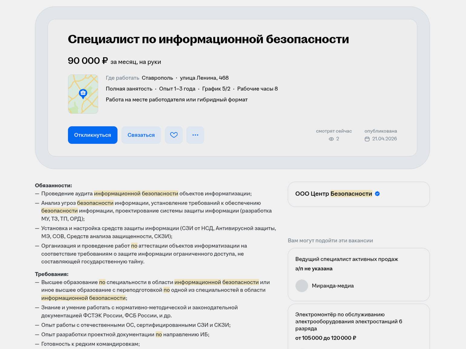 Вторая вакансия — из Ставрополя с окладом 90 000 рублей. На этом примере хорошо видно, как различается уровень зарплат в столице и регионах. Здесь тоже нужен опыт 1–3 года, но профиль другой. От кандидата ждут знания требований ФСТЭК и ФСБ, участия в аудитах и аттестации объектов информатизации, а также понимания отечественных сертифицированных средств защиты. Обязательное условие — профильное высшее образование.
