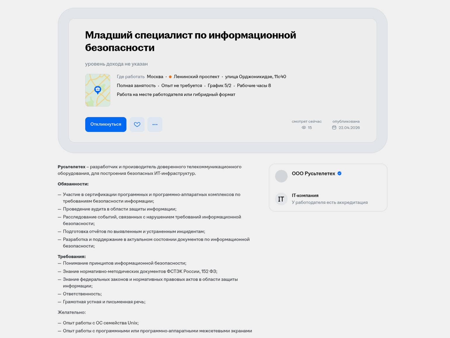 Третья вакансия — младший специалист по ИБ в московской IT‑компании «Русьтелетех». Опыт здесь не нужен, и это типичная входная позиция для новичка. От кандидата ждут понимания принципов информационной безопасности и знания нормативной базы (ФСТЭК, 152‑ФЗ). Среди задач — участие в аудитах, разбор инцидентов, а также подготовка документации.