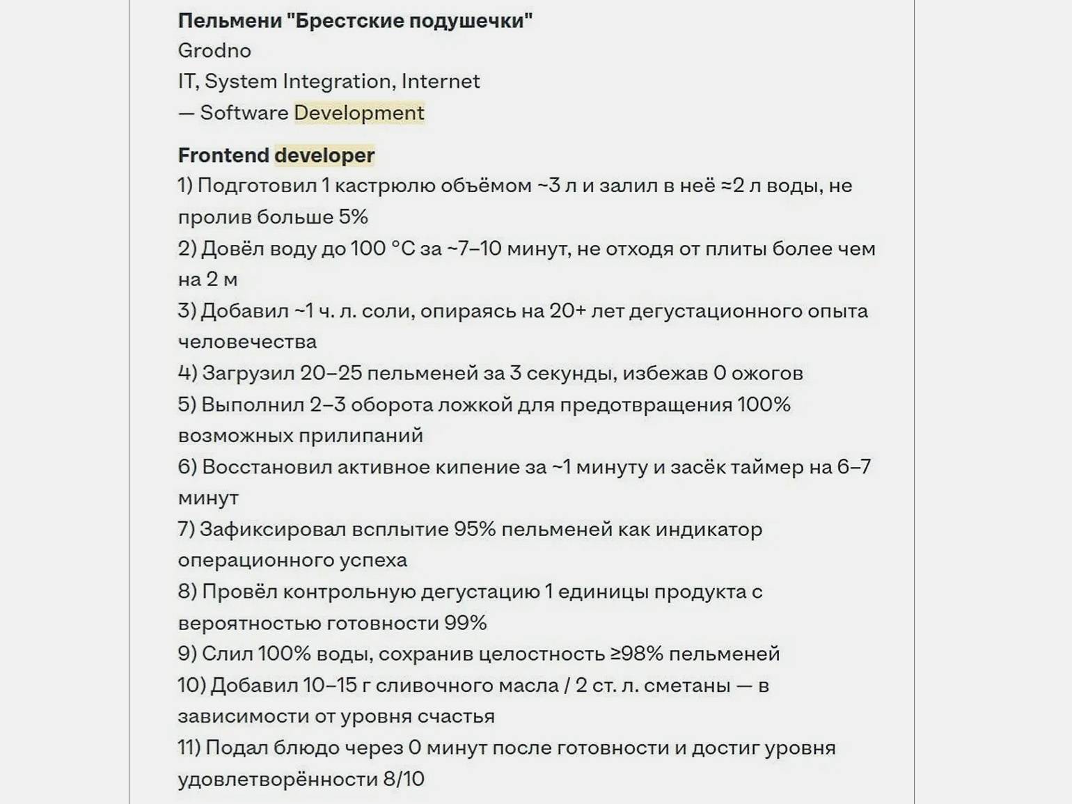 - «Какой рынок найма — такие и резюме»: рецепт пельменей прошёл автофильтры и довёл автора до собеседования