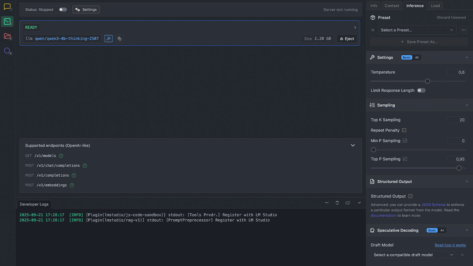 Значок с терминалом открывает раздел Developer. В нём вы можете просмотреть параметры запущенной модели, изучить логи и запустить сервер для подключения нейросети к другим приложениям. Также в этом разделе доступны настройки моделей: вы можете задать системный промпт, управлять инференсом и менять длину контекста.