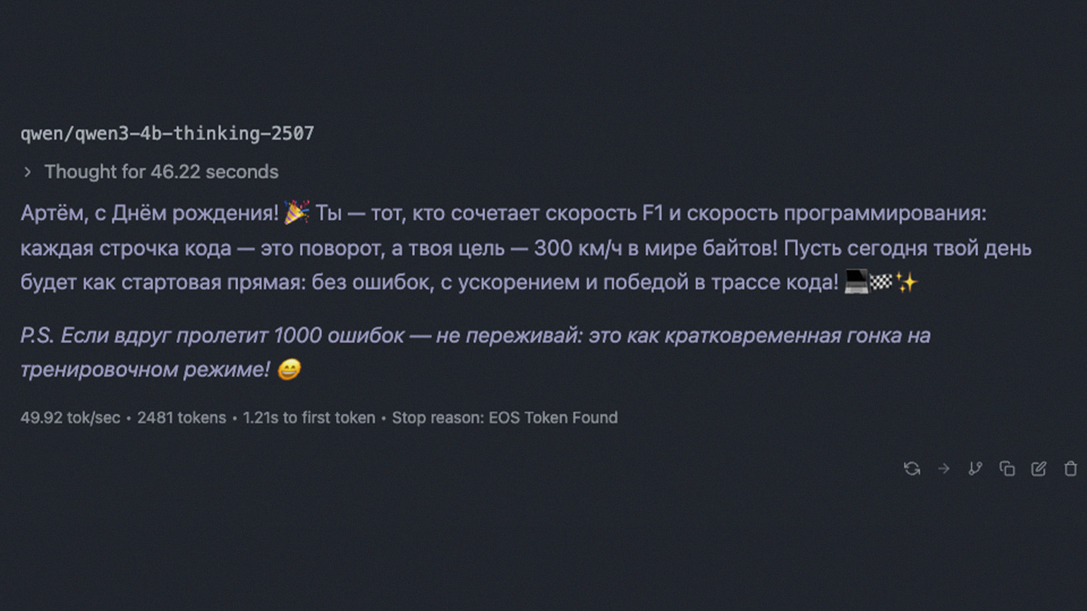 Для теста мы попросили Qwen 3 сгенерировать поздравление с днём рождения для вымышленного друга Артёма. Чтобы усложнить задачу, мы указали, что в тексте должны быть креативные упоминания «Формулы-1» и программирования — увлечений именинника. Текст вы видите ниже, а нам остаётся лишь вручить его какому-нибудь Артёму: