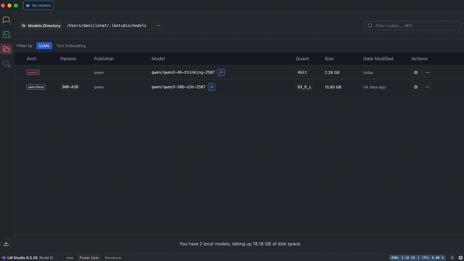 Помимо поиска, на левой боковой панели находятся значки папки и терминала. Значок с папкой открывает раздел My Models — здесь отображаются все языковые модели, которые сохранены на компьютере. Если вы выберете любую из них, то увидите имя разработчика, количество параметров, тип квантизации и размер файла. А если модель больше не нужна, то отсюда её можно удалить.