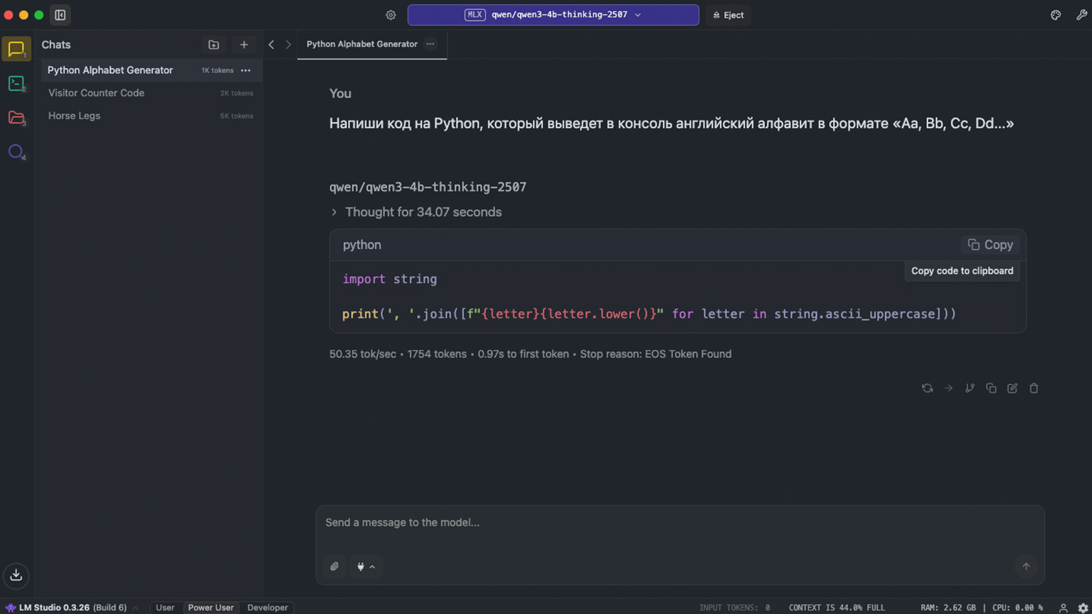 После этого откроется окно чата, где вы сможете ввести запрос для нейросети. Мы установили рассуждающую модель, поэтому перед генерацией ответа она некоторое время будет анализировать ваш запрос и подбирать оптимальный вариант. Также в чате будет отображаться цепочка рассуждений, и по ней вы сможете понять, почему нейросеть выбрала такое решение или где могла ошибиться.