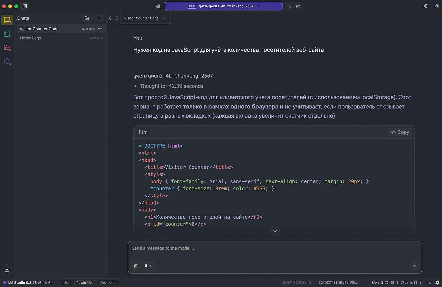 Никаких выводов из этого мы не делаем. Возможно, стоит глубже разобраться в настройках каждого сервиса, перезапустить их или попробовать другие модели. Если у вас будет желание — обязательно поэкспериментируйте. Но, если хочется начать без лишних сложностей, — в конце 2025 года мы можем порекомендовать только LM Studio.