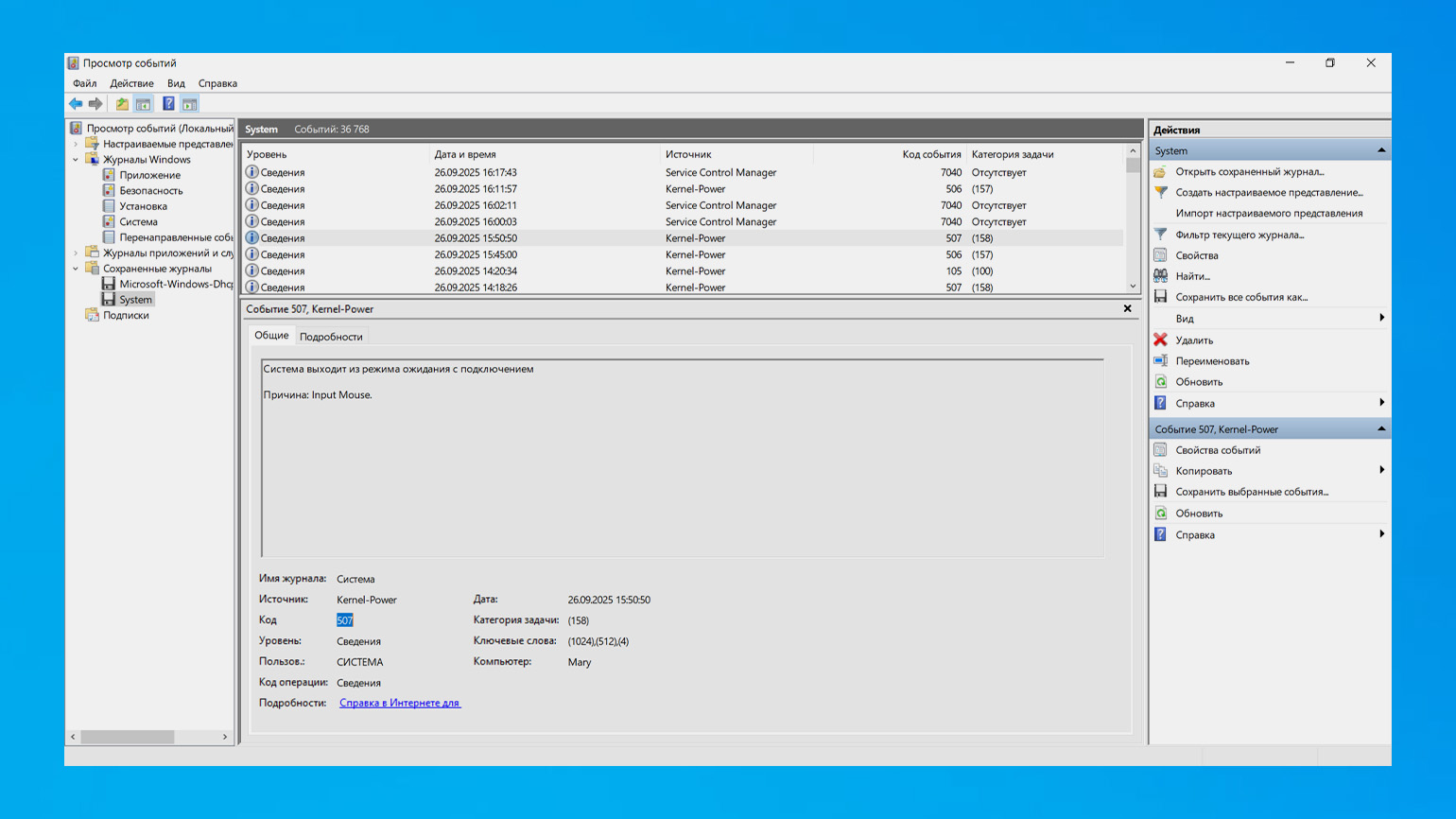 Пример: System.evtx фиксирует ошибки драйверов, загрузку служб и сбои оборудования.
