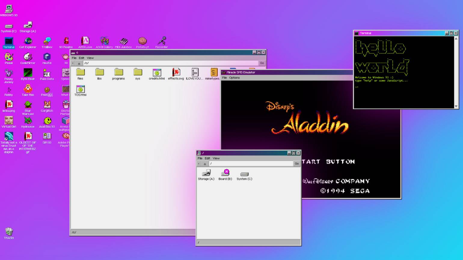 Windows 93 — пародийная веб-версия выдуманной операционной системы в стиле Windows 95. Внутри десятки странных приложений, игр и пасхалок в духе ОС 1990-х. Можно исследовать рабочий стол, запускать программы, открывать файлы и ностальгировать по эпохе раннего интернета и dial-up-модемов.